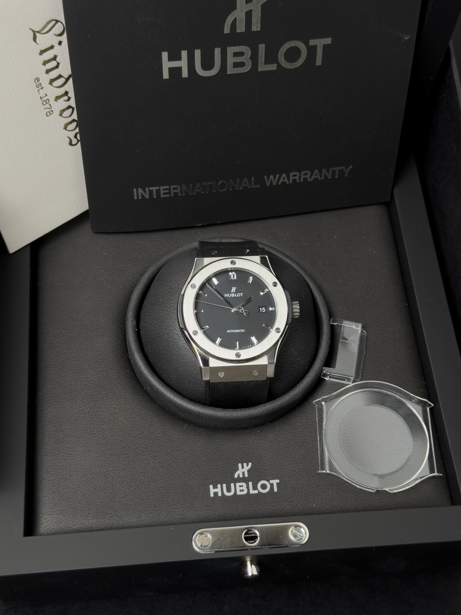 Hublot Classic Fusion 542.NX.1171.RX. Titaanisella 42mm kuorella varustettu CF. Kello on täyshuollettu (Lindroos, Hinta 885€) 10/2025 ja huoltotakuu on voimassa 10/2027 saakka. Kelloa ei ole huollon jälkeen käytetty kuin muutamia kertoja. Mukaan tulee kaikki (Full set). Kellon takuukortti on päiväämätön joten vuosimalli ei tiedossa. Tästä todella hyvä laite arkeen ja juhlaan!