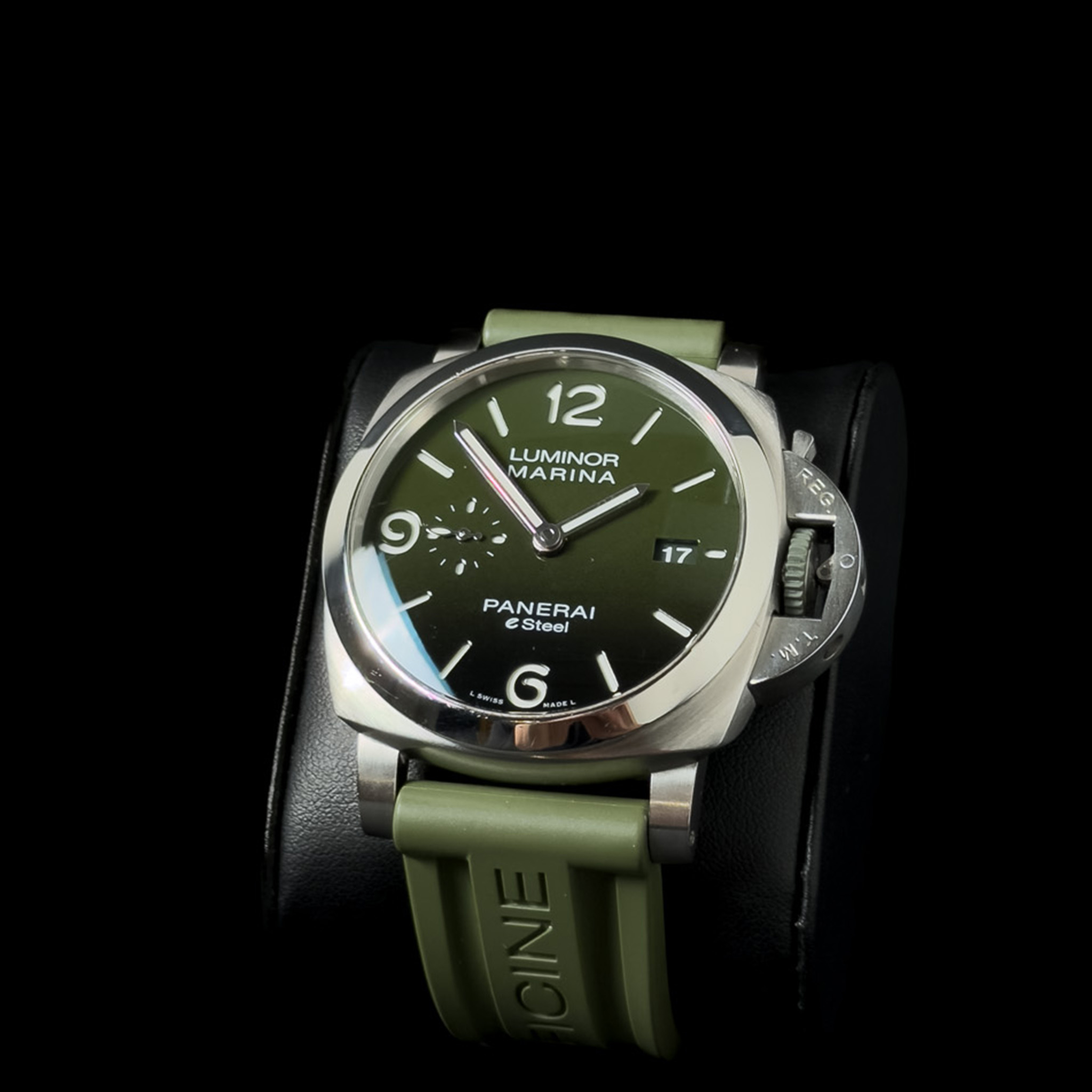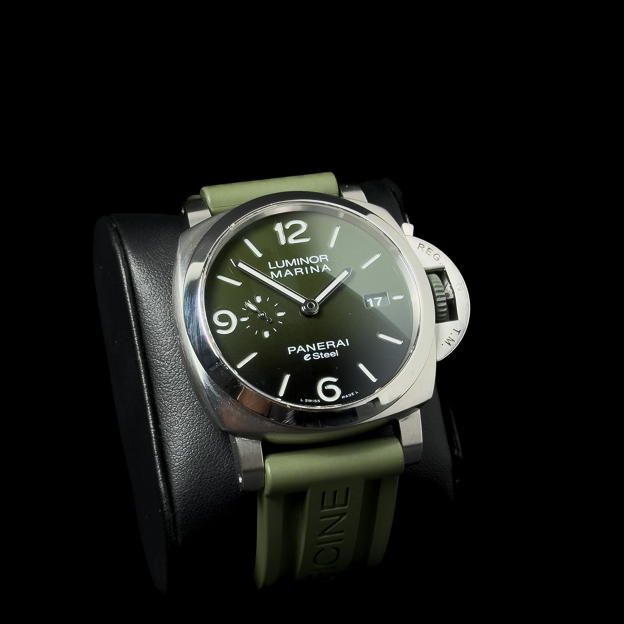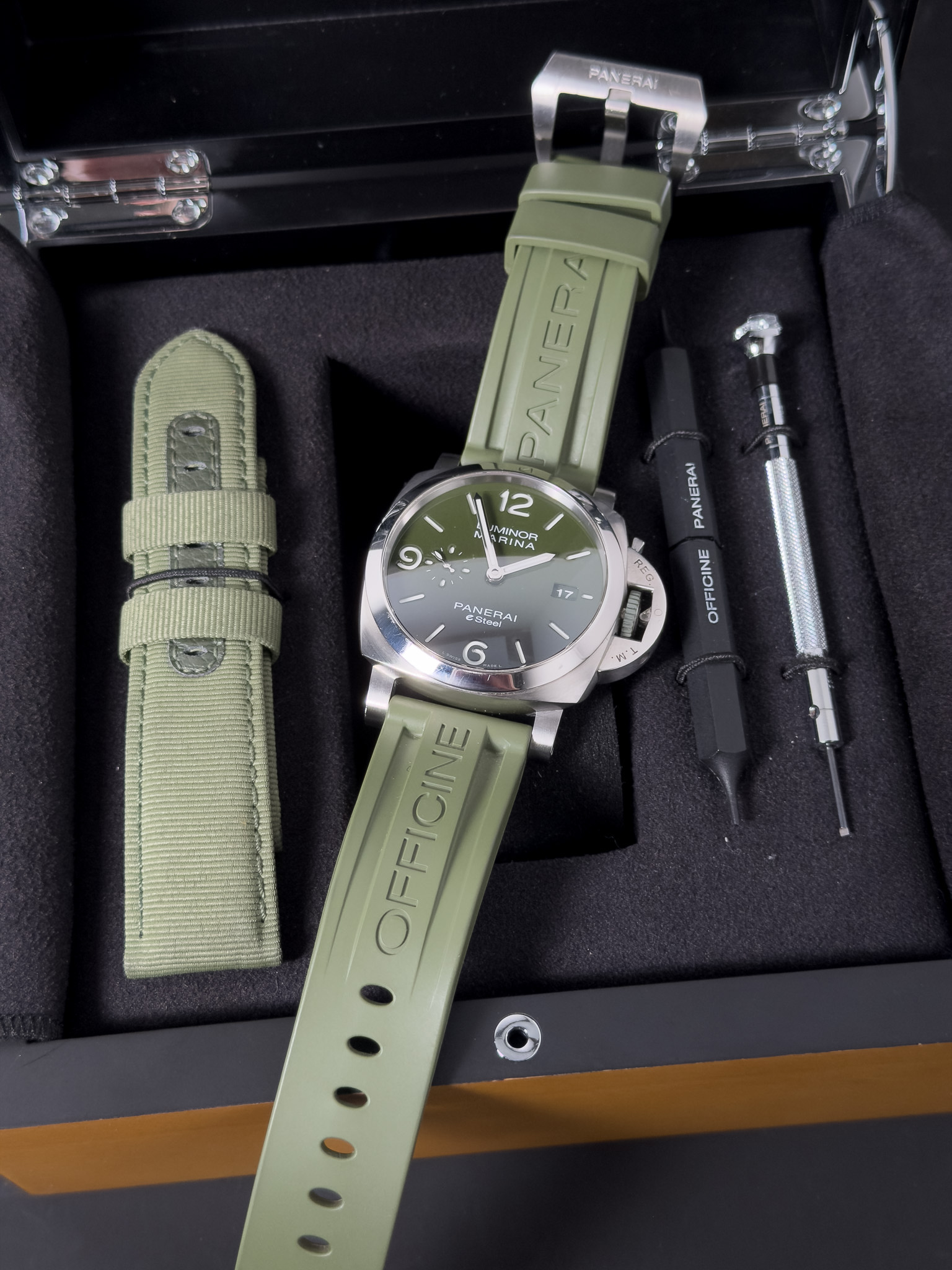 Panerai Luminor Marina Verde Smeraldo PAM01356. Todella upea vihreällä kellotaululla oleva Luminor Marina eSteel. Kello on hienossa kunnossa ja siitä löytyy vain kevyttä käytönjälkeä. Alkuperäiset paperit on päivätty 10/2022 ja jatkotakuu on voimassa 10/2030 saakka. Mukaan tulee ostokuitista lähtien kaikki, ainostaan alkuperäinen tyyny laatikosta puuttuu. Tässä todella upea laite erinomaiseen hintaan!
