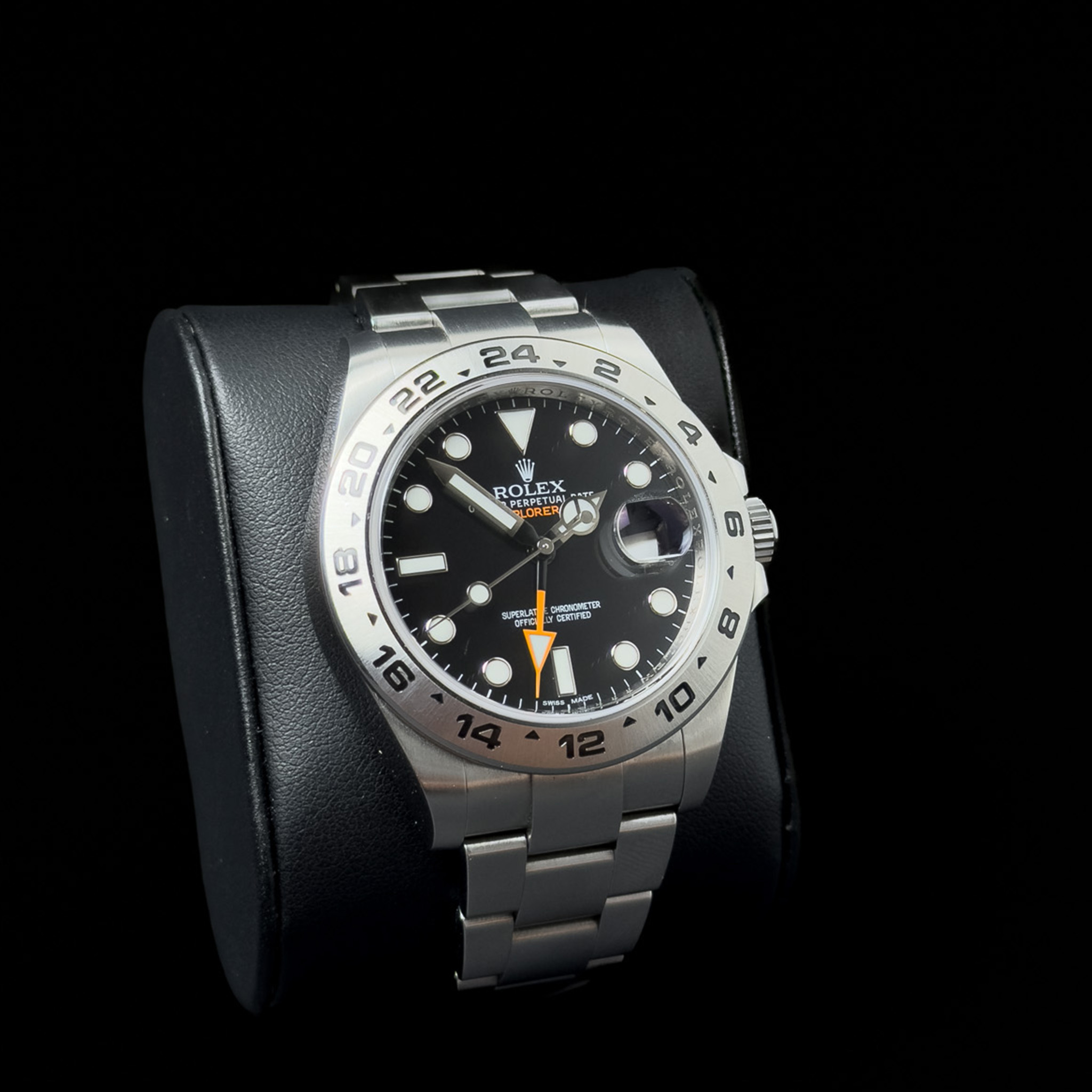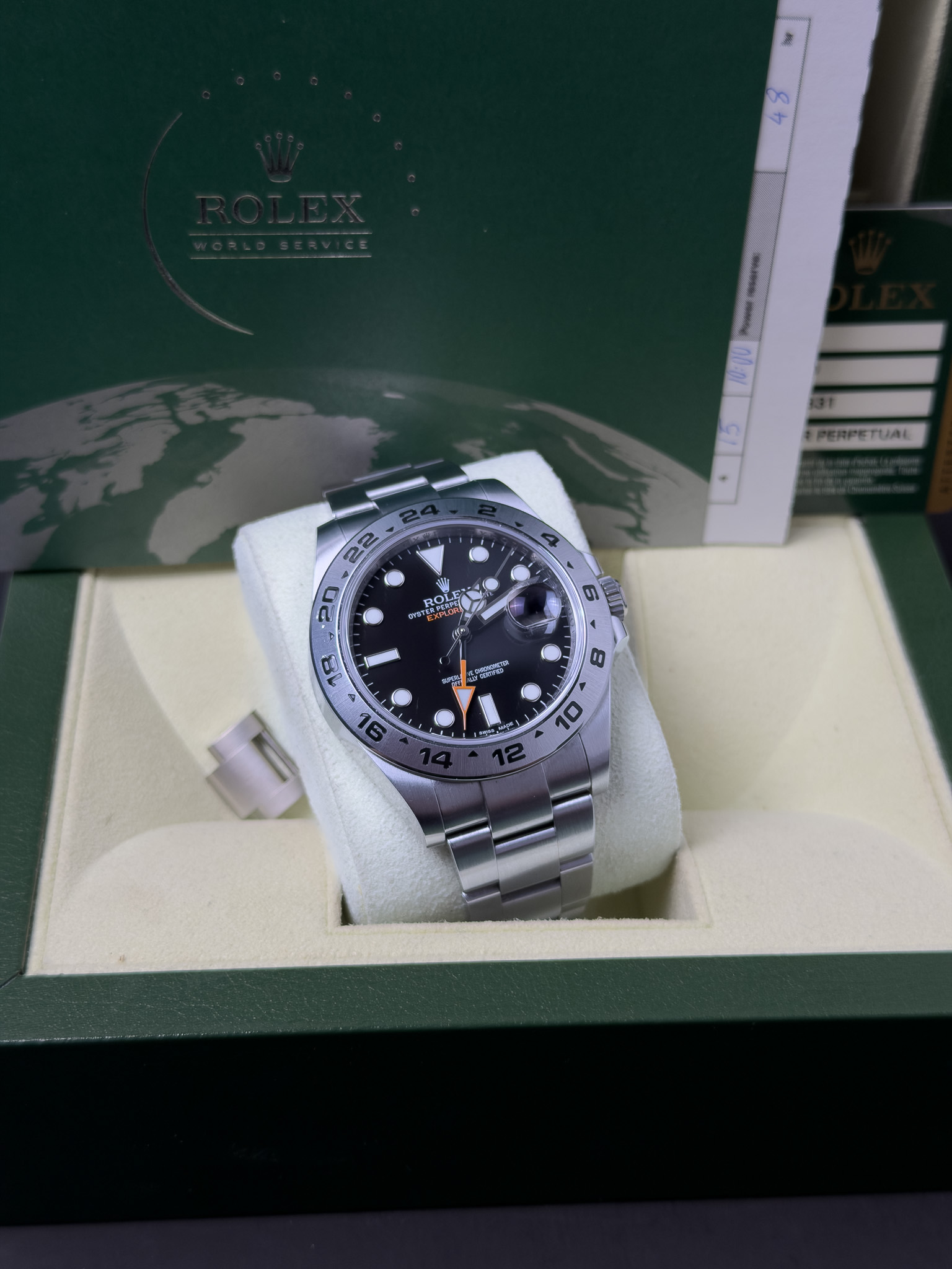 Rolex Explorer II 216570. Tästä seuraavalle seikkailijalle hienossa kunnossa oleva Exp2. Kellon koneisto on juuri RSC huollettu 3/2026 ja Rolexin huoltotakuu on voimassa 3/2028 saakka. Kellon alkuperäiset paperit on päivätty 8/2014. Mukaan tulee; Takuukortti, laatikko ilman pahveja ja huoltodokumentit (Hovisepät). Tästä loistava ”all rounder” huippuhintaan ja juuri huollettuna. Takuu 6 kk.