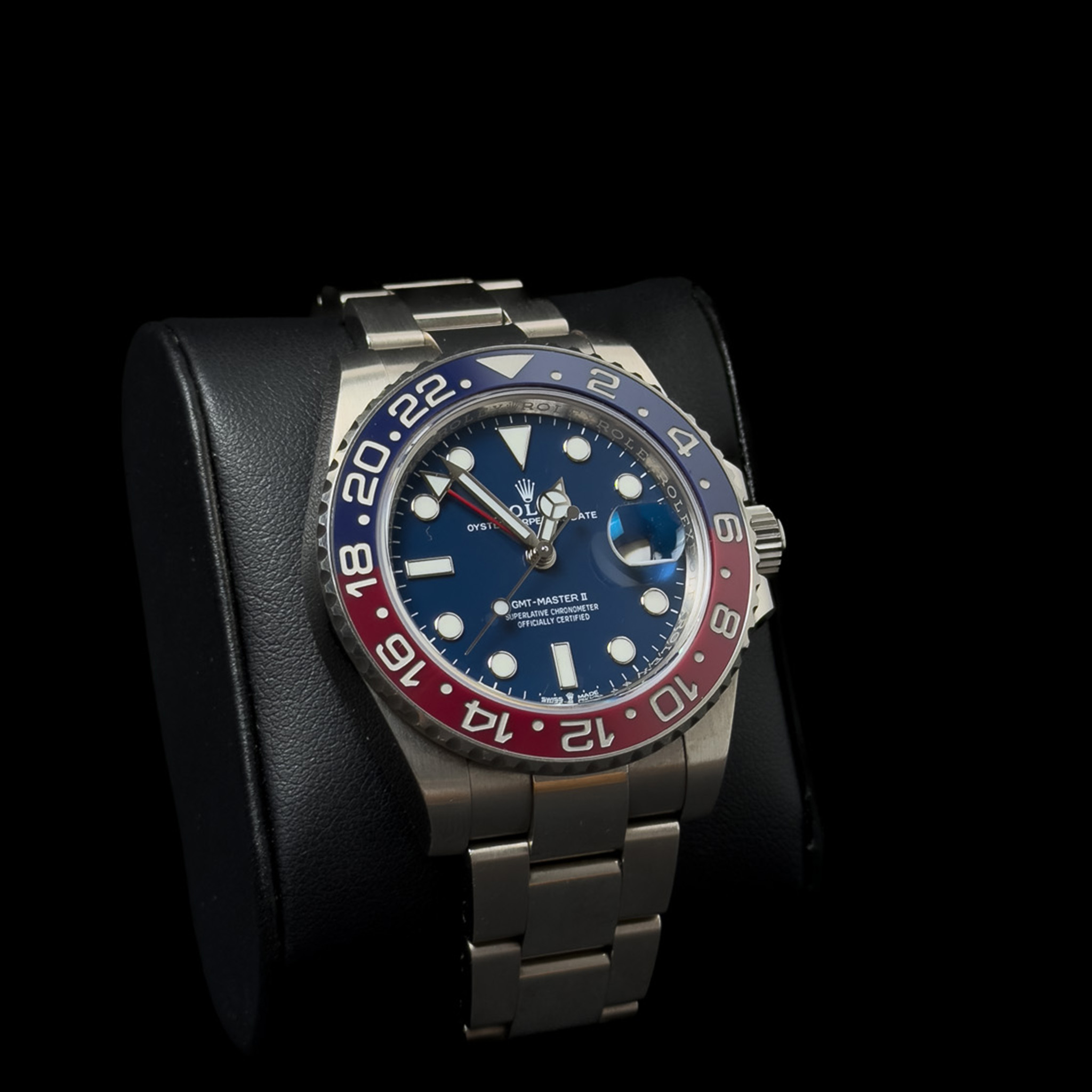 Rolex GMT-Master II 126719BLRO. Todella upea valkokultainen GMT-Master II sinisellä kellotaululla! Kellon alkuperäiset paperit on päivätty 1/2022 ja valmistajan 5 vuoden takuu on voimassa 1/2027 saakka. Kellosta löytyy kevyttä käytönjälkeä, jotka voidaan kiillottaa pois näin haluttaessa. Mukaan tulee kaikki mitä uutenakin (Full set). Tässä todella raju laite sopivaan hintaan! Uuden ovh. 51400€