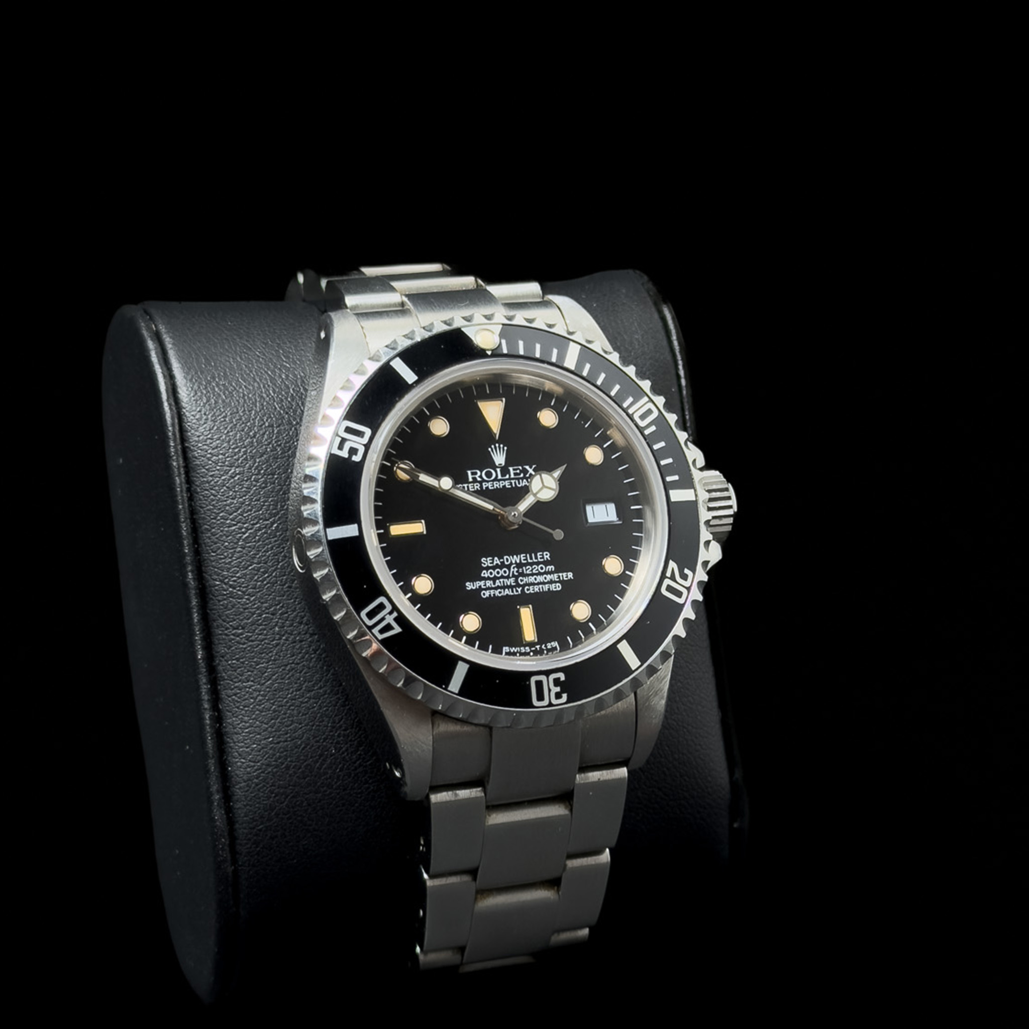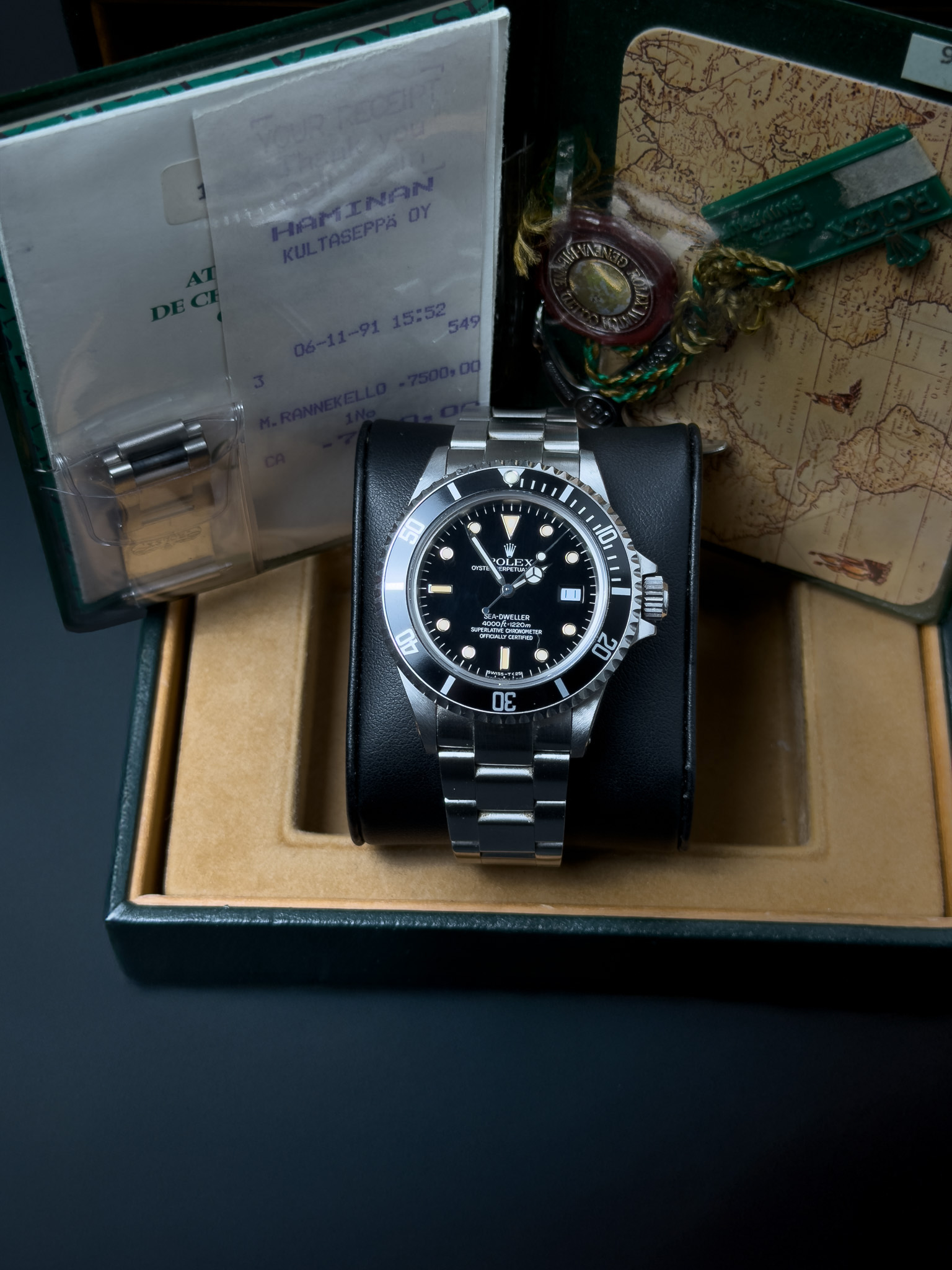 Rolex Sea-Dweller 16660 "Triple Six". Todella upeasti säilynyt "Triple Six" Suomi historialla! Kello on sarjanumeron perusteella vuodelta 1987 ja se on myyty uutena Suomesta 11/1991. Kello on säilynyt erinomaisessa kunnossa ja taulun indeksit on patinoitunut todella tasaisesti! Takakannessa on vielä alkuperäiset tarrat paikallaan. Mukaan tulee: Alkuperäiset paperit, alkuperäinen ostokuitti, ankkuri, tagi, kalenteri, sukellusjatko, manuaali, laatikko ilman tyynyä. Ranneke on täysmittainen, eikä siinä juurikaan ole venymää. Tässä harvinaisen hyvin säilynyt keräilykappale!