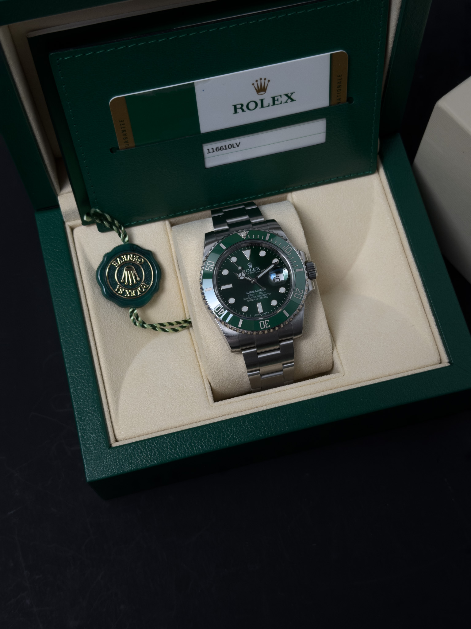 Rolex Submariner Date 116610LV. Upeassa kunnossa oleva tuotannosta poistunut ”Hulk”. Kellon alkuperäiset paperit on päivätty Sveitsissä 10/2015. Kello käy erinomaisin arvoin. Mukaan tulee kaikki (Full set). Takuu 6kk.
