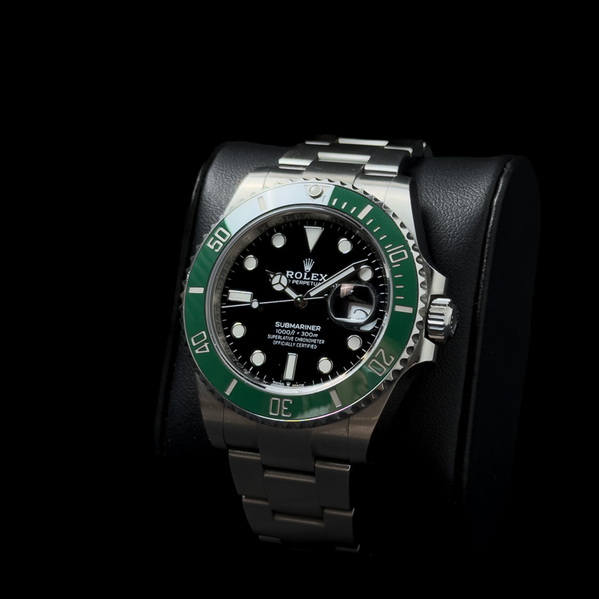Rolex Submariner Date 126610LV ”Starbucks”. Hienossa kunnossa oleva Starbucks! Kellon alkuperäiset paperit on päivätty 1/2022 ja valmistajan 5 vuoden takuu on voimassa 1/2027 saakka. Kello on siistissä kunnossa claspissa ja rannekkeessa on kevyttä käytönjälkeä. Mukaan tulee kaikki (Full set).