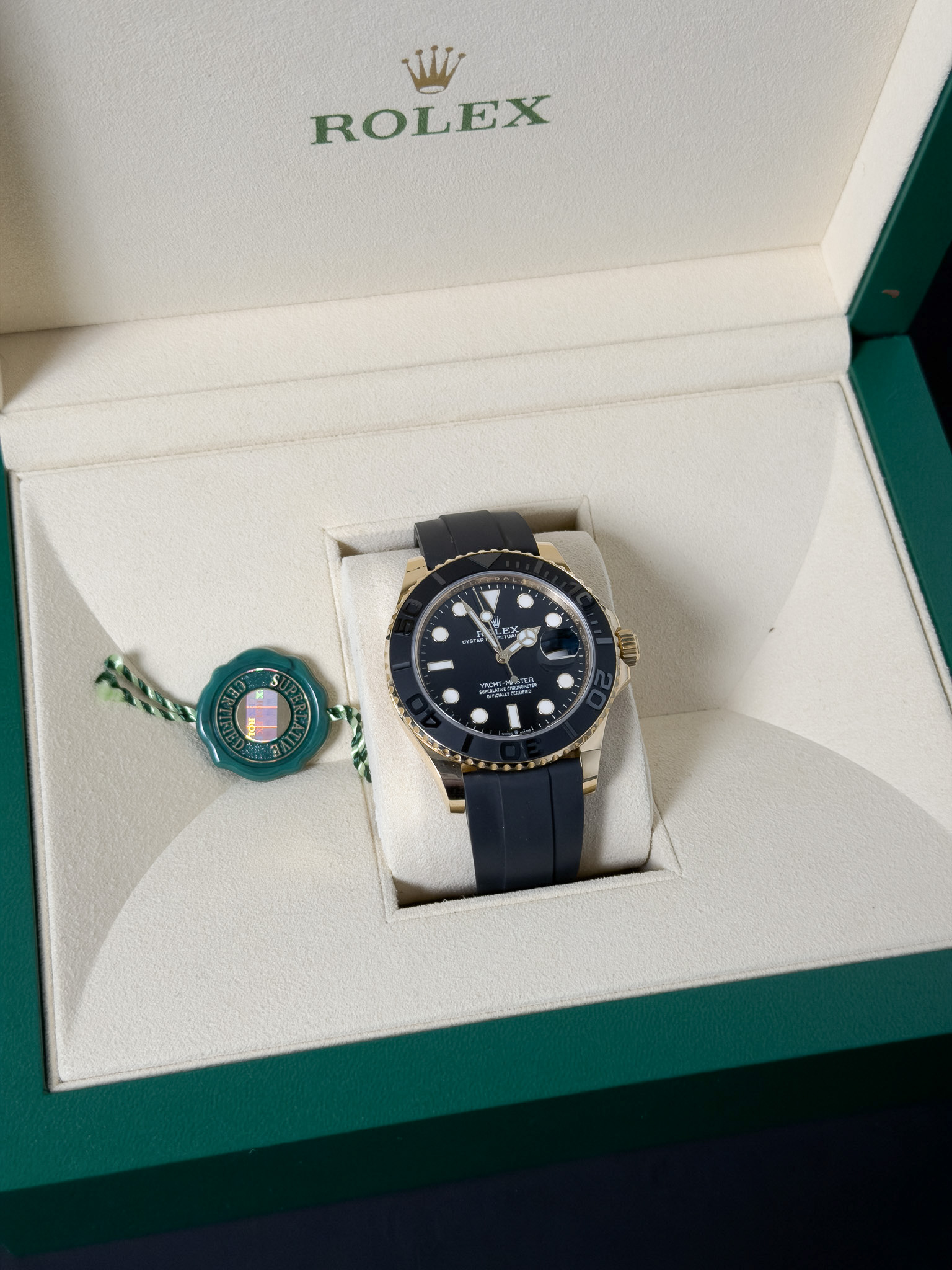 Rolex Yacht-Master 226658. Erinomaisessa kunnossa oleva Yacht-Master keltakultaisena ja 42mm koossa. Rannekkeena todella miellyttävä OysterFlex clidelock ominaisuudella. Kellon alkuperäiset paperit on päivätty 9/2022 ja valmistajan 5 vuoden takuu on voimassa 9/2027 saakka. Mukaan tulee kaikki (Full set). Tässä todella upea laite! Nykyinen ovh. 35000,-