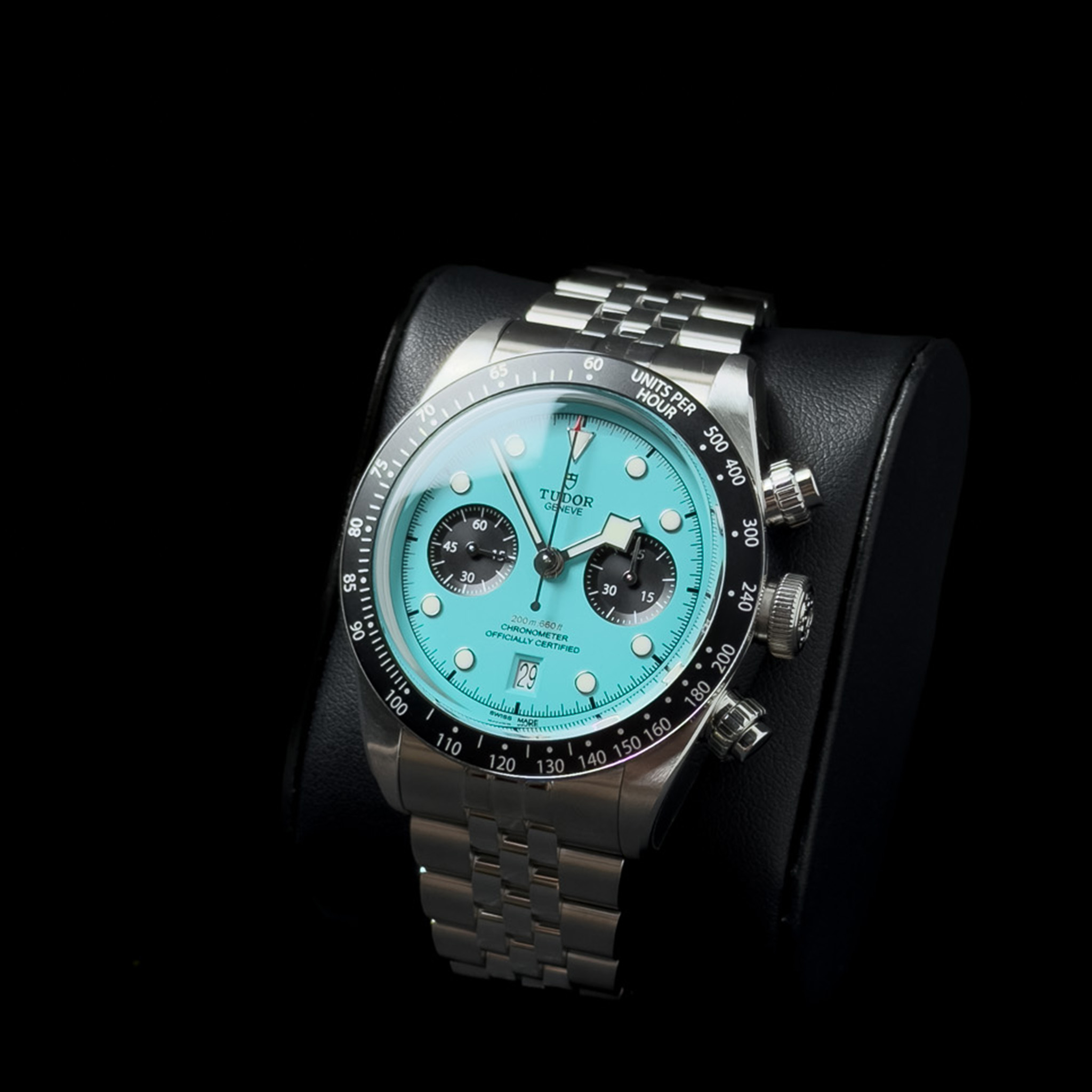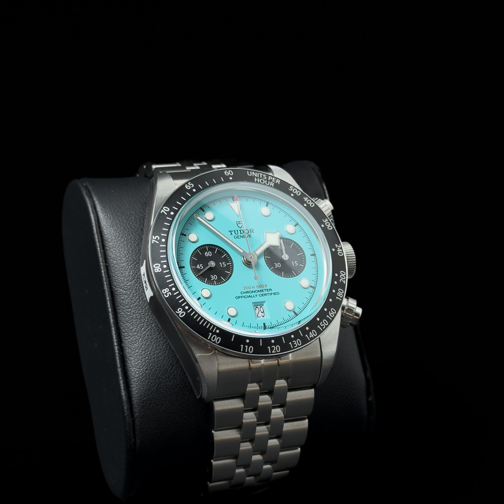 Tudor Black Bay Chrono M79360N-0024 "Flamingo Blue". Todella upea Tudorin uutuus turkoosilla taululla! Erittän haluttu malli minkä saatavuus on heikkoa! Kellon alkuperäiset paperit on päivätty 11/2025 ja valmistajan 5 vuoden takuu on voimassa 11/2030 saakka. Kello on täysin tehtaan muoveissa ja käyttämätön! Mukaan tulee kaikki (Full set).