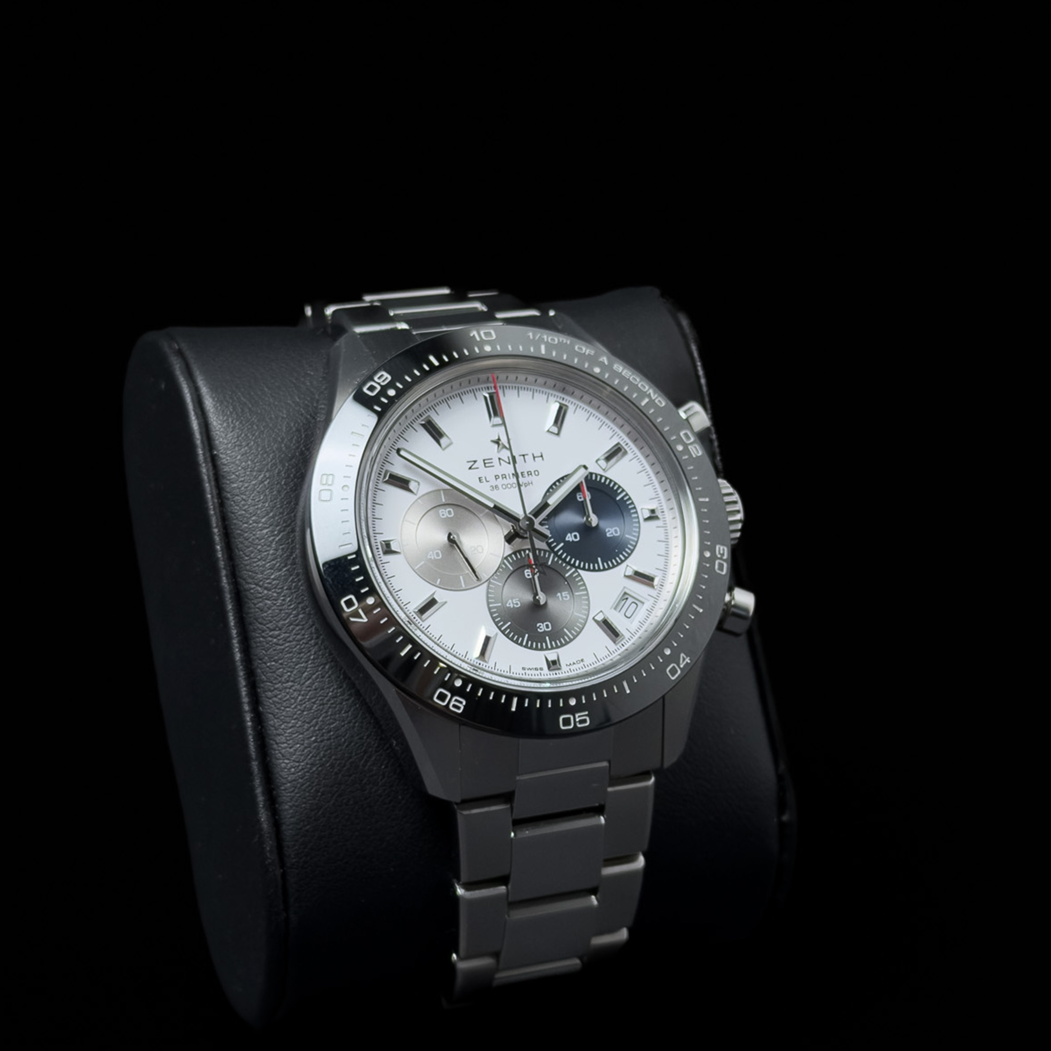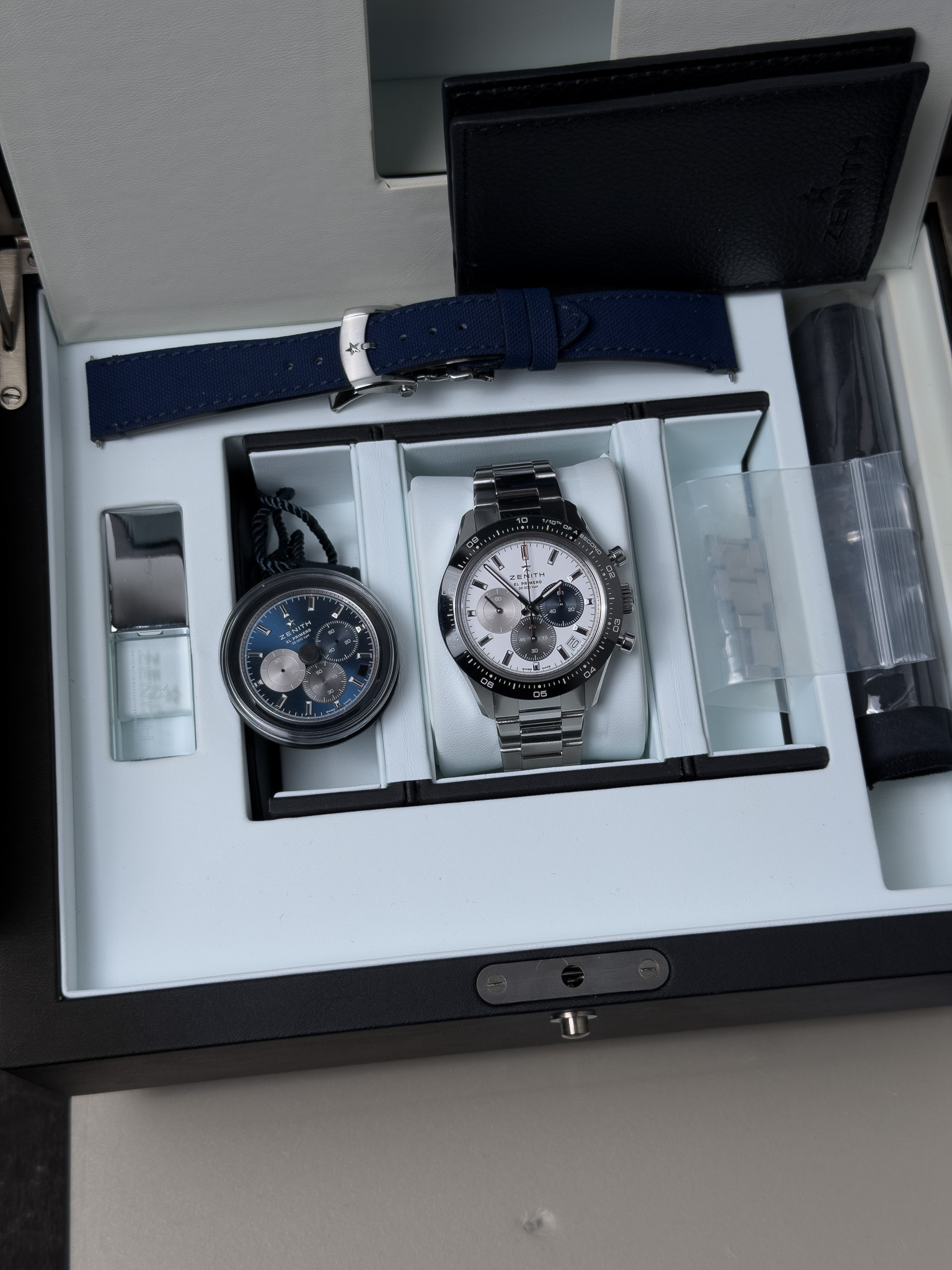 Zenith Chronomaster El Primero Sport. Erinomaisessa kunnossa oleva Chromaster Sport. Kellon alkuperäiset paperit on päivätty 2/2021 ja mukaan tulee kaikki mitä uutenakin (Full set). Mukaan tulee lisäksi etukortti mikä oikeuttaa yhteen ilmaiseen huoltoon (Zenith huolto) tieto löytyy myös Zenihin järjestelmästä. Kelloon on hankittu myös myöhemmin julkaistun sinitauluisen version taulu. (Huom! hinta molemmilla tauluilla 7 000,- & Pelkällä valkoisella 6 600,-). Tästä älyttömän hieno setti erinomaiseen hintaan! Ovh. 11 800,- Takuu 6kk.